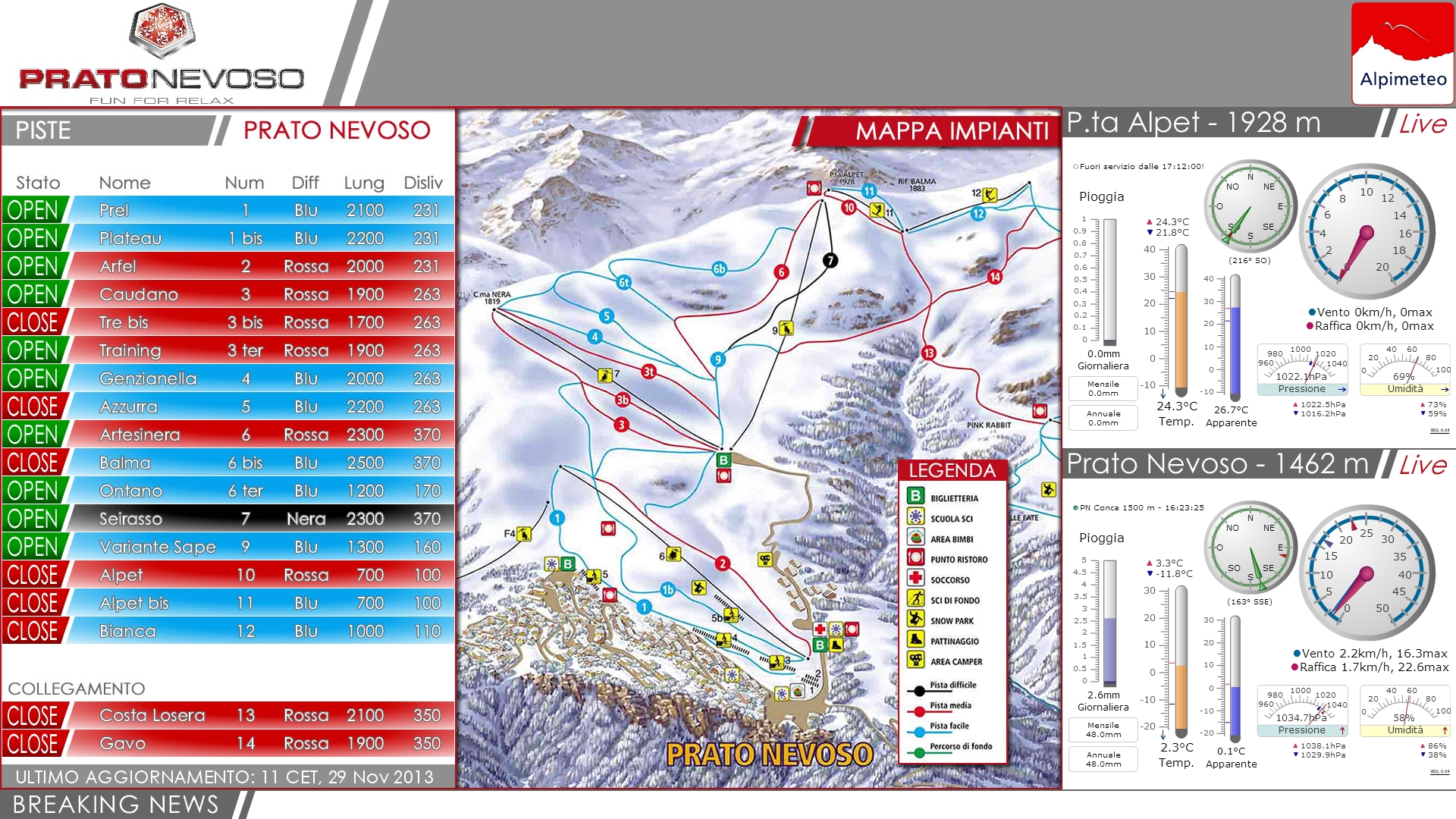 Prato Nevoso Ski è in continua crescita e i risultati importanti raggiunti negli anni passati, hanno invogliato la struttura ad arricchire ancor di più l’offerta dei servizi ai propri clienti. Da qui la scelta di attivare ed installare il servizio di previsioni e monitoraggio meteo ambientale Alpimeteo, con l'obiettivo di offrire agli sciatori presenti un'informazione puntuale e localizzata abbinata ad uno standard qualitativo elevato.
